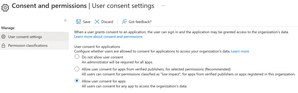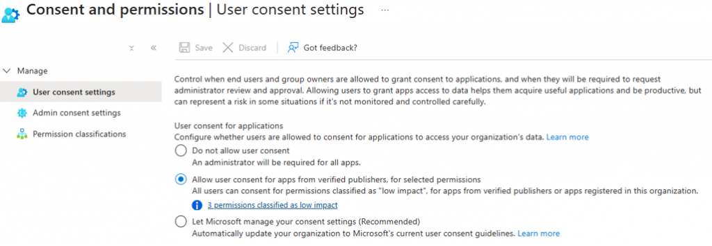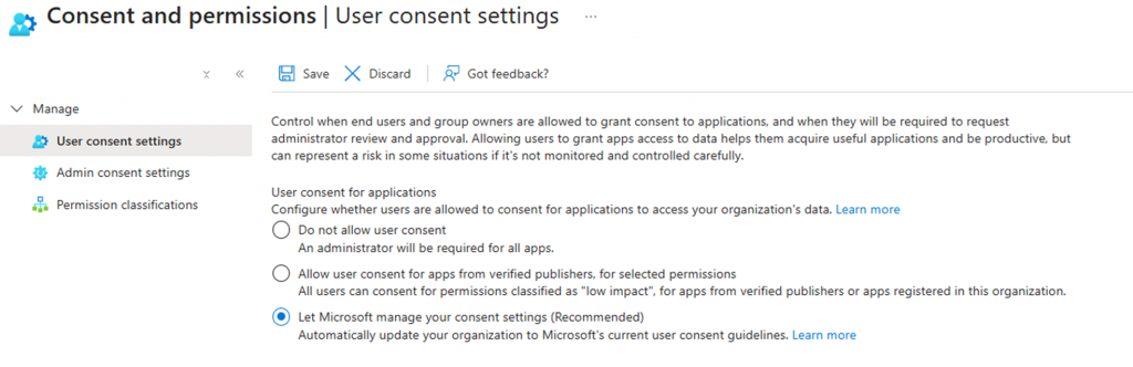 - Set User consent settings to “Let Microsoft manage your consent settings (Recommended)”