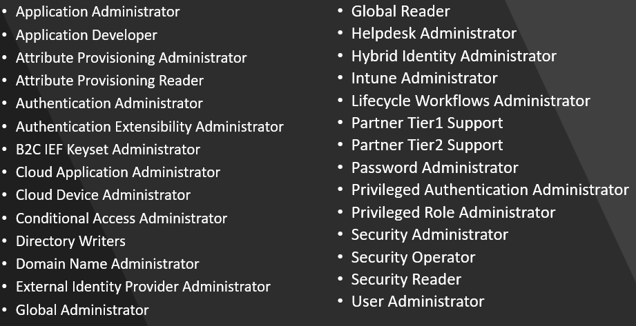 Microsoft has tagged 28 roles as “Privileged“. These roles should be protected, though not at the same level. For example, Global Reader isn’t the same as the Global Administrator role and the level of protection for accounts in Global Administrator should be higher than that of Global Reader.