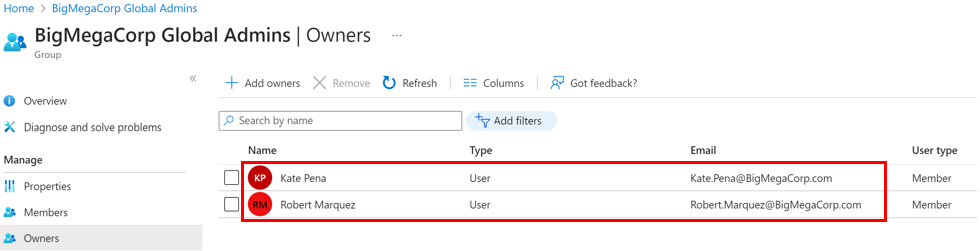 The owners configured on a role assignable group are able to manage the membership of the group. Ensure that the owners are admin accounts and protected at the same level as the role the role assignable group is a member of.