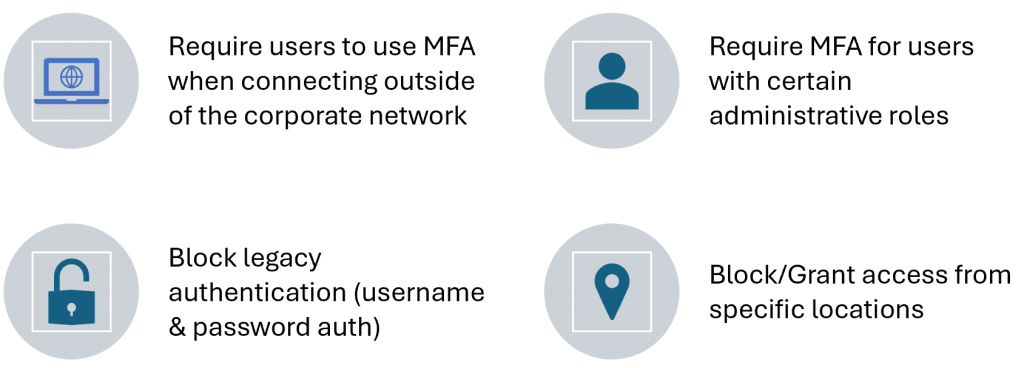 Conditional Access policies apply after first-factor authentication (user name and password). This requires Entra P1 licensing. Conditional Access takes action based on Who is connecting, Where are they connecting from, What app and/or device to which or from which the connection is taking place, and When this applies.