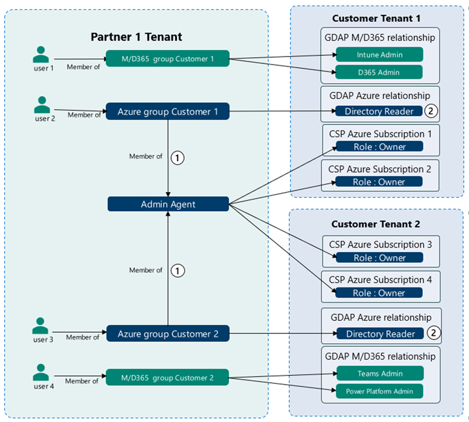 - “Admin agent” role in partner tenant is provided effective “Global Administrator” rights to customer tenant.
