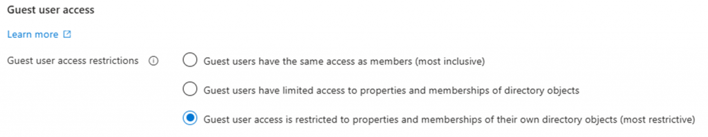 - Set Guest user access restrictions to “Guest user access is restricted to properties and memberships of their own directory objects (most restrictive)”