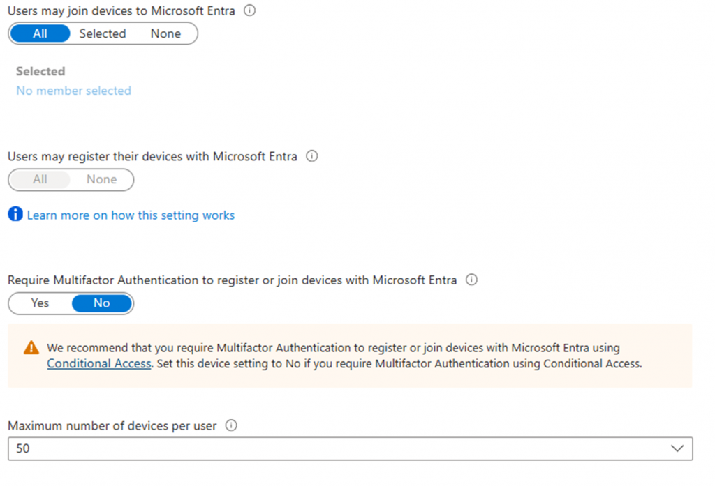 - Either configure a Conditional Access policy to require MFA when joining devices to Entra or set the configuration “Require Multifactor Authentication to register or join devices with Microsoft Entra” to “Yes”.